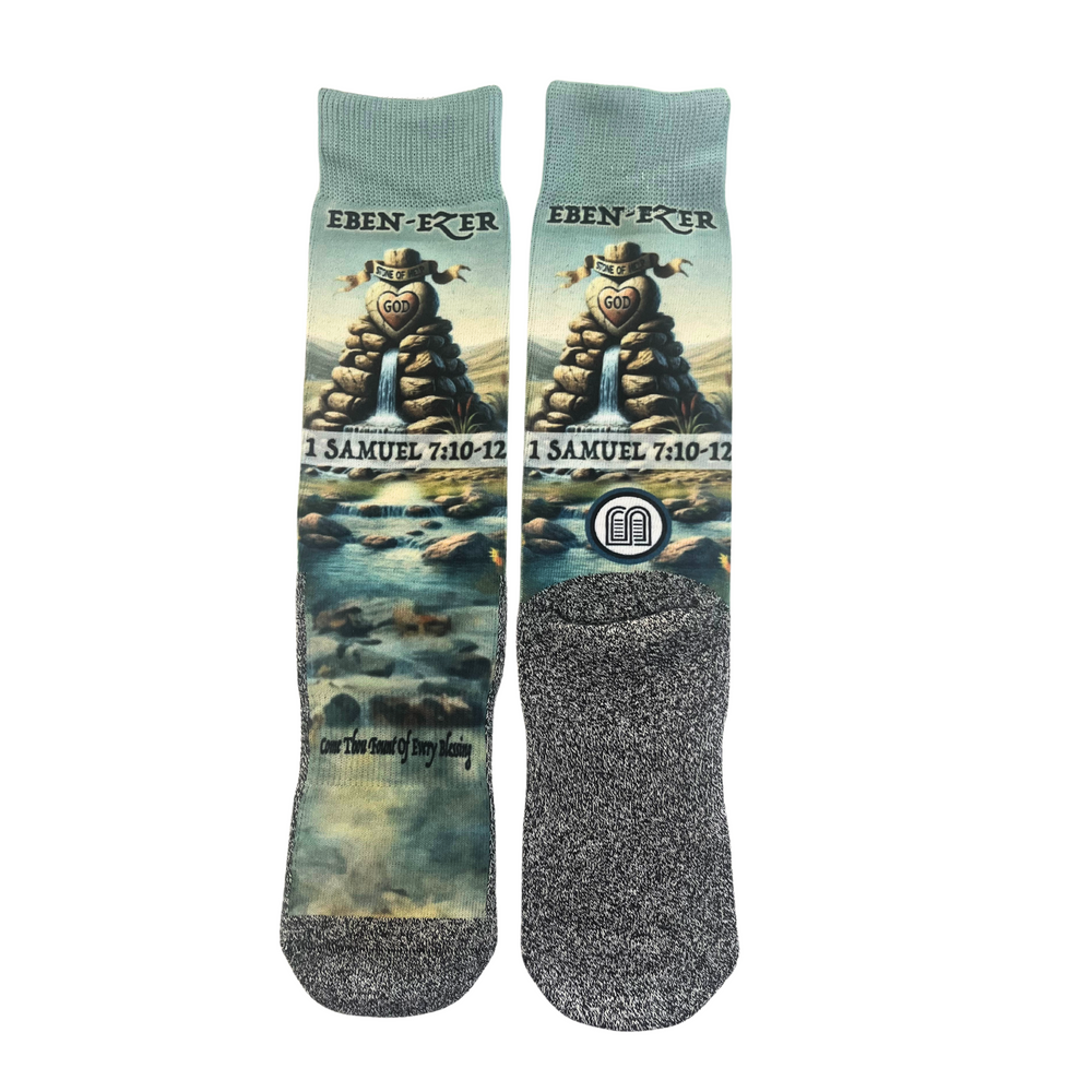 This design features an artistic blend of earthy tones, a symbolic "Stone of Help" (Eben-ezer) engraved with a heart representing God’s love, and a flowing fountain of pure water. These socks are not just artistically stylish—they’re a walking sermon on gratitude, grace, and the ultimate Helper.