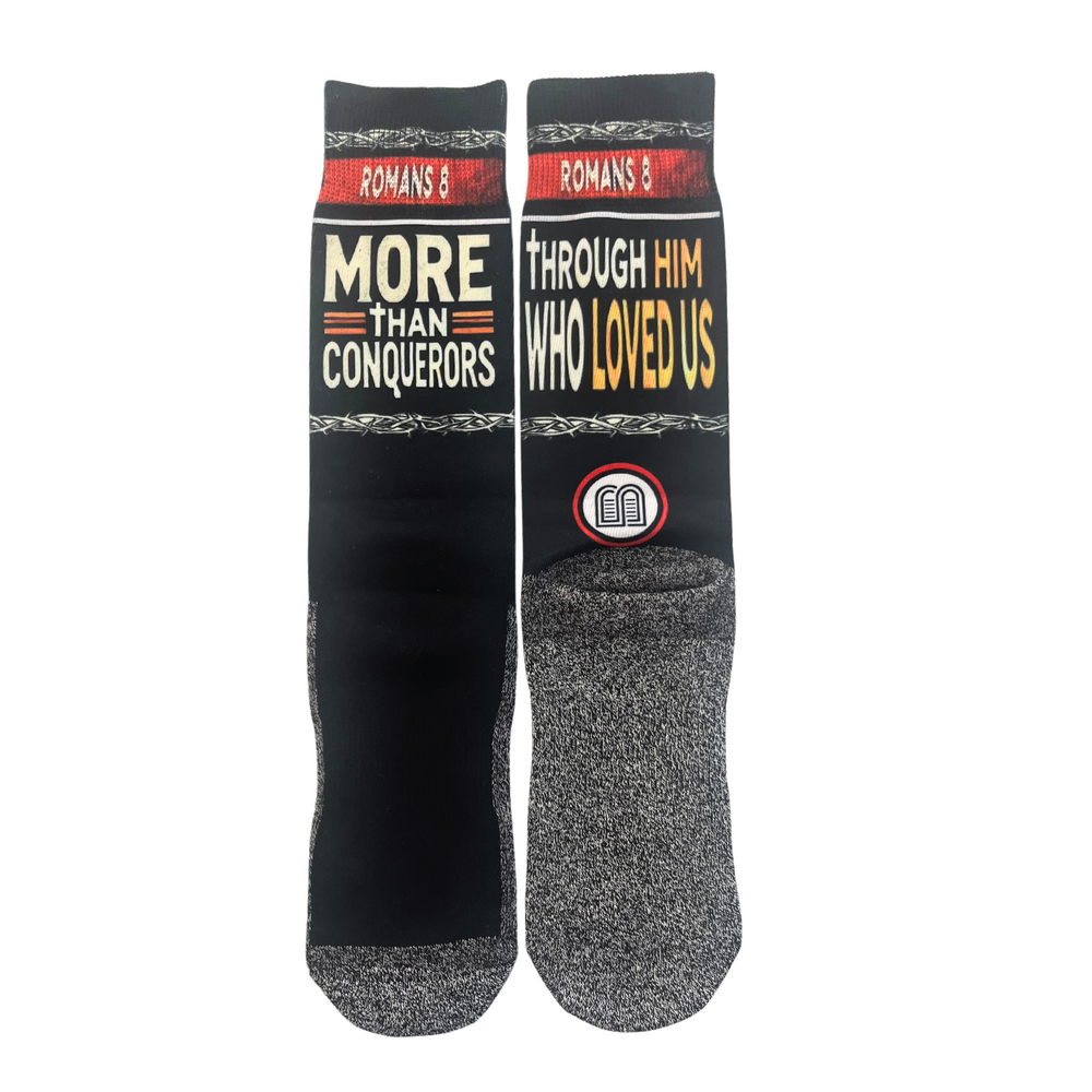 Introducing the “More Than Conquerors” socks—a subtle yet striking tribute to one of the most powerful promises in scripture (Romans 8:35-39)