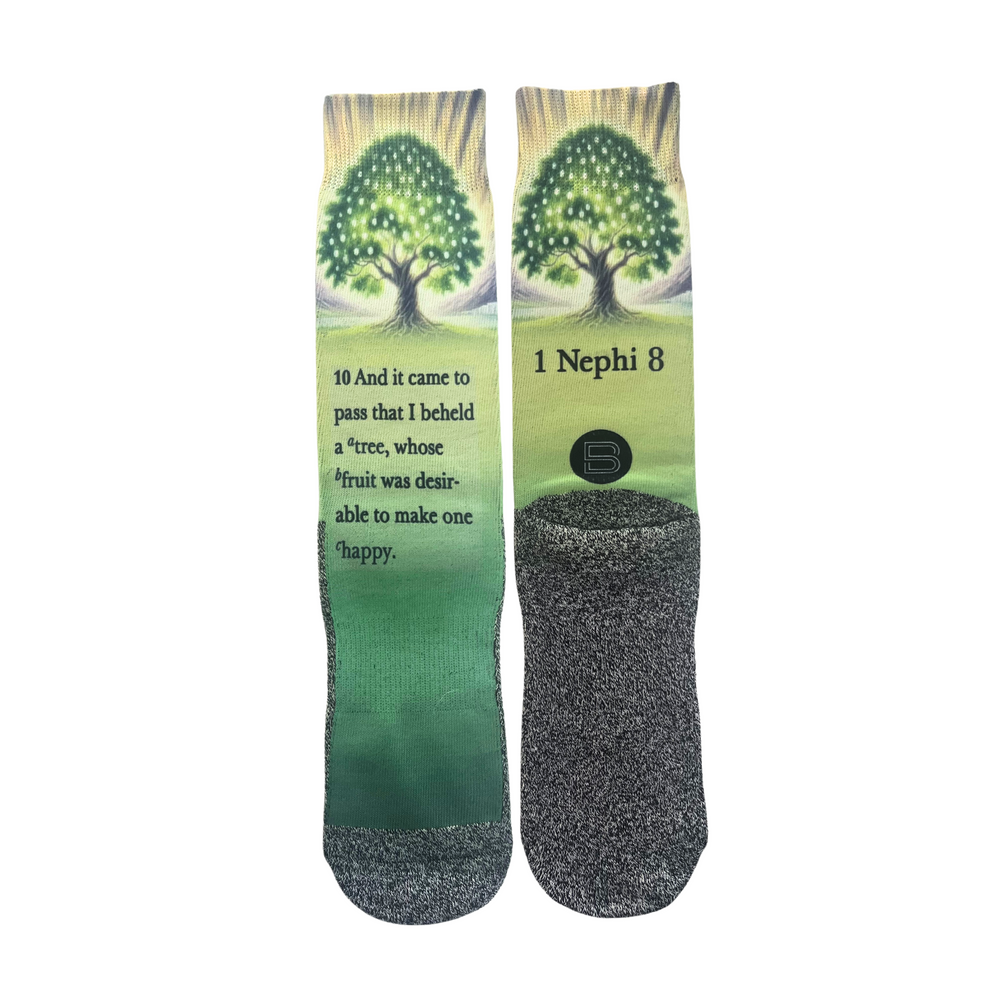 Introducing the “Tree of Life” socks—a bold, bright journey for your feet inspired by 1 Nephi 8:10, where Lehi reminds us that the fruit of the tree is “desirable to make one happy.” These vividly green socks get brighter as you approach the top, leading you straight to the tree and its glorious fruit—because who doesn’t want a reminder of eternal happiness while strolling through life (or church meetings)?
